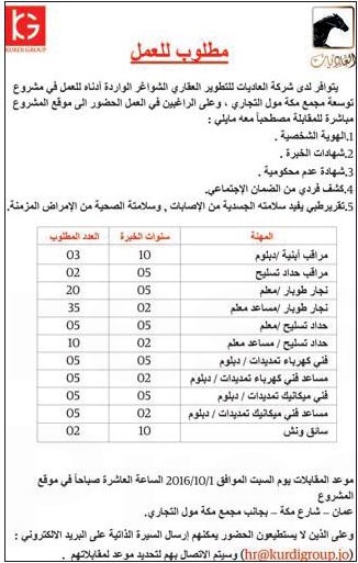 وظائف الصحف العربية وظائف الصحف الاردنية جريدة الغد الخميس 29 9 2016 مطلوب لشركة العاديات للتطوير العقاري مراقب أبنية مطلوب مراقب حداد تسليح مطلوب فني ميكانيك مطلوب مساعد فني ميكانيك مطلوب فني كهرباء